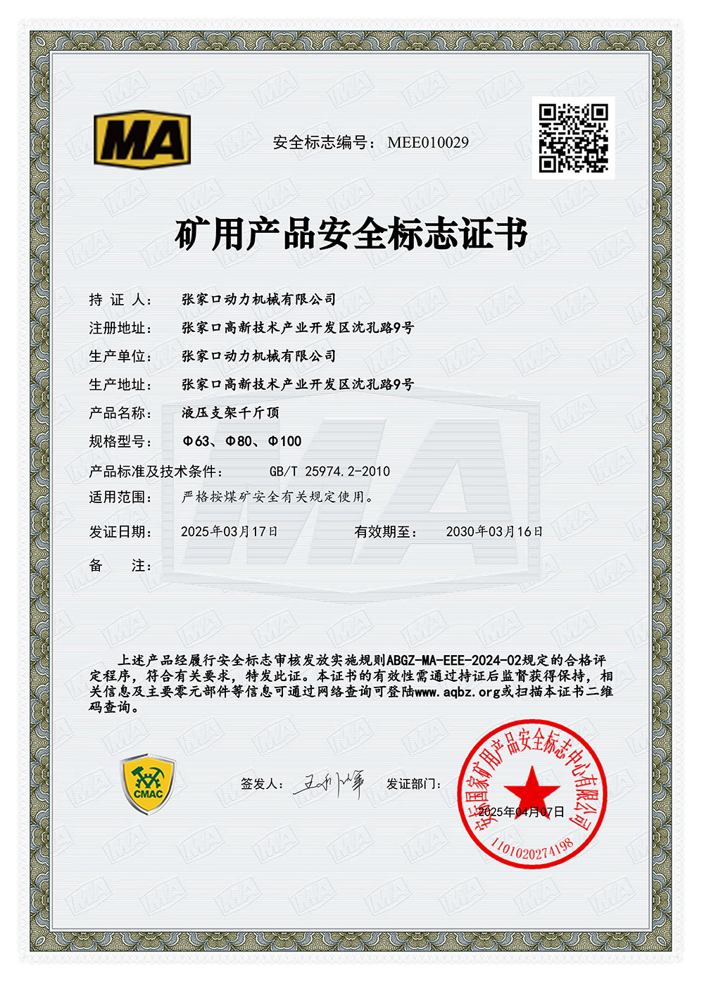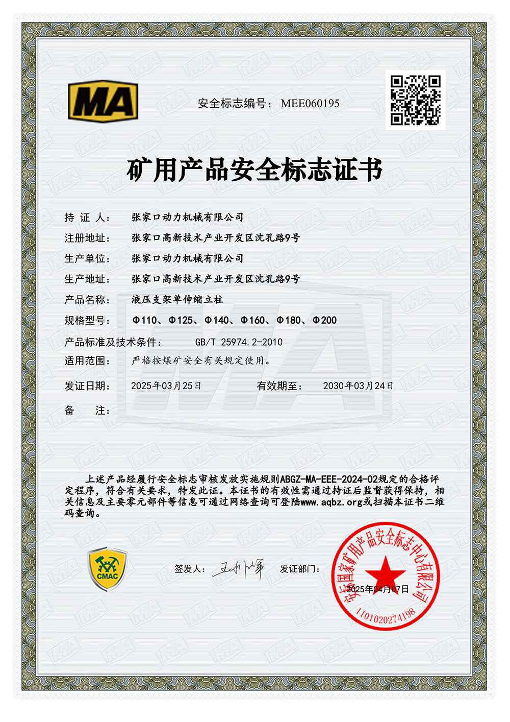 張家口動力機(jī)械有限公司生產(chǎn)資質(zhì)展示